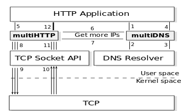 The mHTTP design consists of: (i) multiHTTP: a set of modified socket APIs which splits content into multiple chunks, requests each chunk via individual HTTP range requests from the available servers, reassembles the chunks and delivers the content to the application. (ii) multiDNS: a modified DNS resolver that obtains IP addresses for a server name by harvesting the DNS replies and/or by performing multiple lookups of the same server name by contacting different domain name servers.